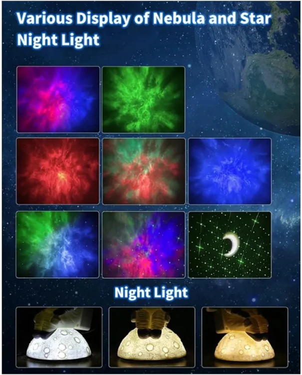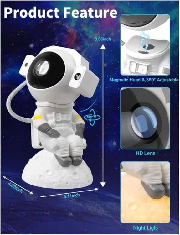 فضانورد کهکشان پروجکشن: با این ویژگی می توانید اتاق خود را به یک سرزمین عجایب کیهانی تبدیل کنید. نور شب صحنه ای خیره کننده از کهکشان را بر روی دیوارها و سقف شما پخش می کند که شامل ستاره ها، سیارات و کهکشان ها می شود. پیکره فضانورد حس خاصی به نمایشگر اضافه می کند و آن را برای علاقه مندان به فضا در تمام سنین عالی می کند.